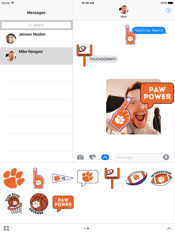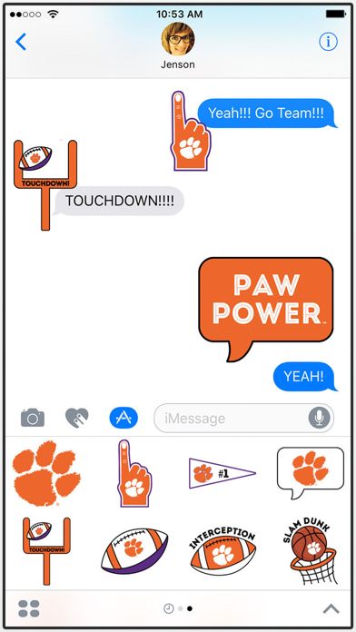 This is an officially licensed Sticker Pack from the Clemson University. Sticker packs include the Clemson logo, Clemson branded footballs and basketballs, football goal posts, chat bubbles and more. These stickers can be used in iMessage to show your school spirit in both text messages and on photos. Just drag them onto your message thread and they will be shared instantly with whomever you are messaging with. Have fun and Eat 'Em Up!!