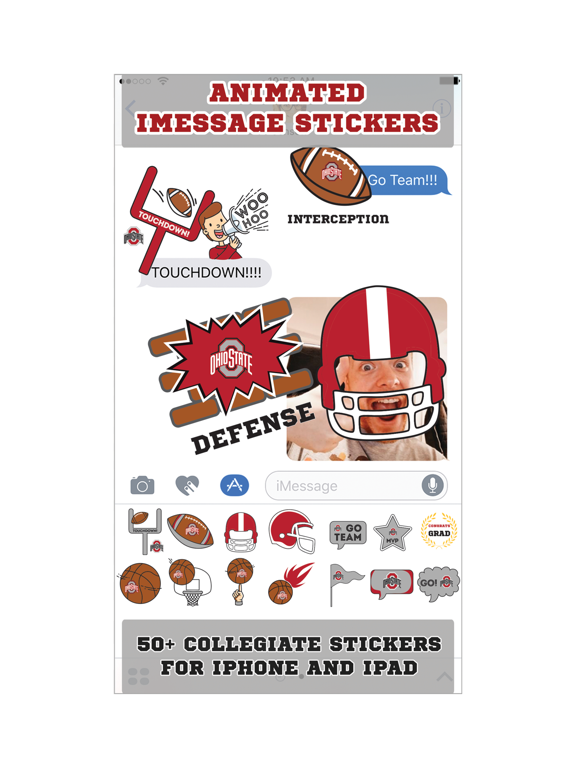 Animate your text and photo messages Buckeyes style with the Ohio State Buckeyes Animated+Stickers for iMessage!! The Ohio State Buckeyes Animated+Stickers for iMessage is an officially licensed Animated Sticker Pack from The Ohio State University that includes Animated Stickers, Photo Stickers and Static Stickers. The Ohio State Buckeyes Animated+Sticker Pack for iMessage includes over 50 various static stickers, including, Foam Fingers, Helmets, Go Team Banners, Footballs, Basketballs, Sunglasses, Word Marks and more and a dozen animated stickers including: Cheering Fan, Touchdown, Defense, Interception, Fireworks, and more. These stickers can be used in iMessage to show your school spirit in text messages and on photos. Just drag them onto your message thread or onto a photo sent through iMessage and they will be shared instantly with whomever you are messaging with. Have fun and Go Buckeyes!!!