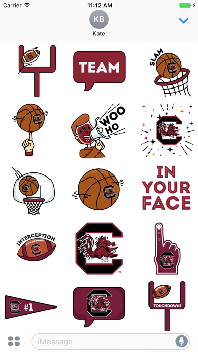 The University of South Carolina Animated+Sticker Pack for iMessage is an officially licensed Premium Sticker Pack from the University of South Carolina that includes a set of expressive Animated and Static Stickers. The University of South Carolina Animated+Sticker Pack for iMessage includes 9 Animated Gamecock Stickers (Slam Dunk Basketball, All Net Basketball shot, Fan Cheering, Basketball Spinning on Finger, In Your Face, Field Goal and more), as well as a suite of branded static stickers (USC logo, USC #1 Finger, Chat bubbles, Footballs, Basketballs and more). These stickers can be used in iMessage to show your school spirit in text messages and on photos. Just drag them onto your message thread or onto a photo sent through iMessage and they will be shared instantly with whomever you are messaging with. Have fun and Go Cocks!!