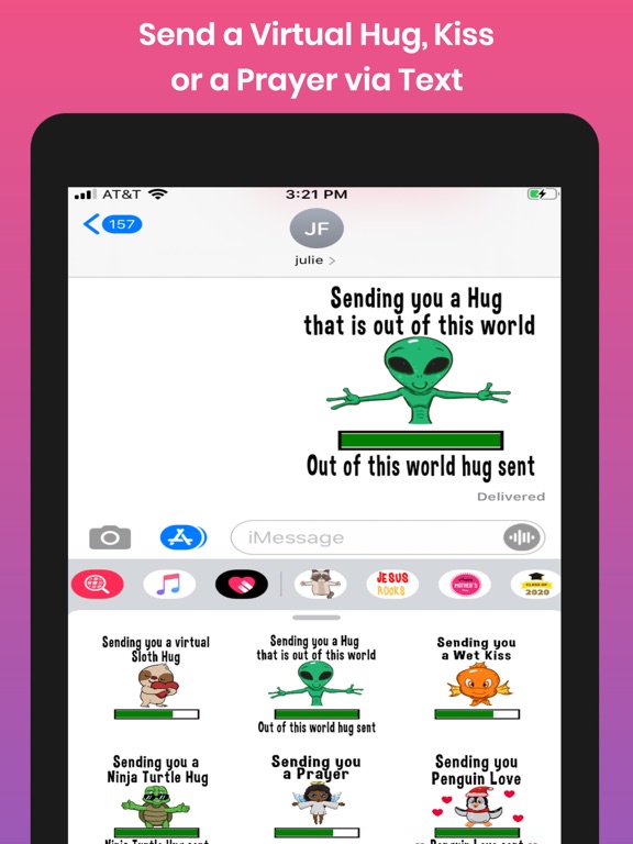 Everyone needs a hug, and while a virtual hug is not the same, it is a great way to show someone you care. That's why we created Virtual Hug Animated Stickers with over 20 ways to send hugs, prayers, kisses, and even flappy ears. Oh, and of course, a grumpy cat hug.