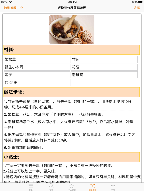 最全最流畅的煲汤菜谱大全,一次下载,所有信息离线使用。所有IOS设备通用,支持一键收藏,摇一摇随机查看,全文搜索。