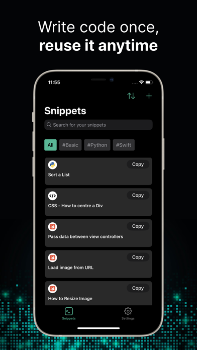 CodeSnippet PRO lets you save all code snippets with 170+ programming languages (Python, Swift, Kotlin, Javascript, Ruby, etc..) and 70+ themes to fit your programming needs.