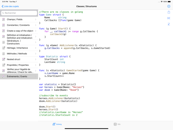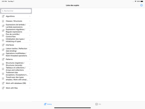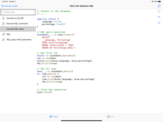 • En tant que développeur, j'utilise cette application lorsque j'ai besoin de me rappeler rapidement comment résoudre une tâche en SQL ou en Golang.