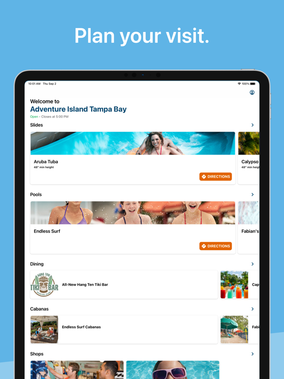 • Discover park amenities, including water slides, pools, cabanas, and dining