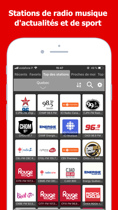 Écoutez les meilleures stations de radio du Canada. Stations de radio que vous pouvez écouter : ICI Radio, Virgin, NRJ 94.3, 98.5 FM, Radio Classique Montréal, Rouge FM, Radio X, CJAD 800, Radio9, CHOM 97.7, CBC, et beaucoup d’autres!