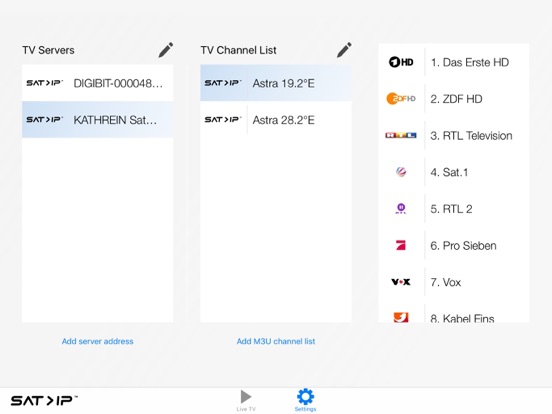 The SAT>IP app works with SAT>IP compliant broadcast tv server devices on your home network. A list of such server devices can be found under www.satip.info.