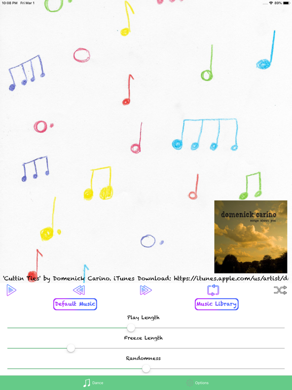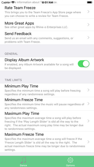 Team Freeze can be customized to how you want to dance. Easy to access sliders allow you to adjust the average length of the time that music is played or paused. More advanced options can also be accessed from the options screen.