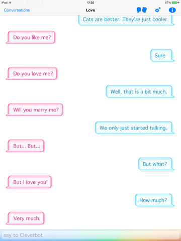 "Cleverbot is epic!!!!!!!!!! He's there when I want to talk about dolphins, There when I want to ask him where babies come from, I am glad I found him. He talks about anything. ANYTHING AND EVERYTHING. Thank god you made this." 30th Jan 2011