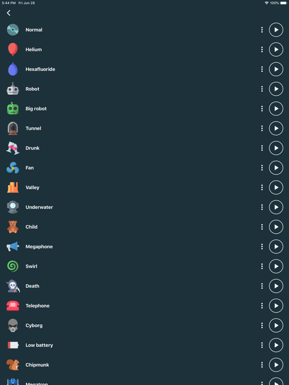 • More than 25 effects: robot, alien, zombie, helium, drunk, chipmunk, death, cave, underwater, devil, telephone, swirl, fan, ... and many more!