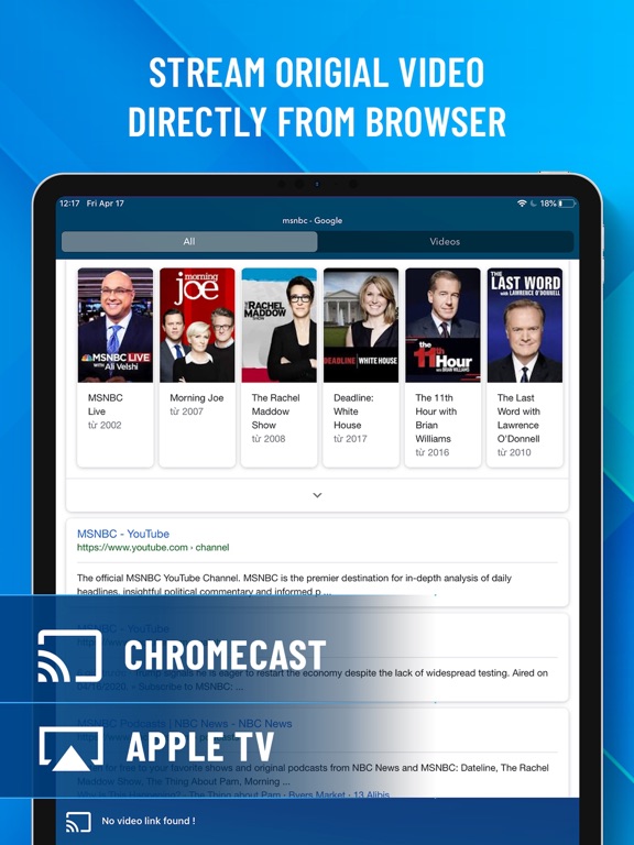 Watch any web video on your Chromecast, Google Cast powered TV or Apple TV. Enjoy the show on your big screen.
