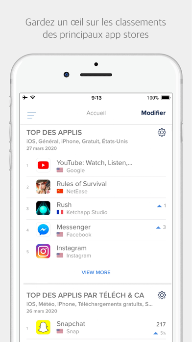 Historique des classements : consultez le classement heure par heure de millions d'apps ainsi que l'historique des classements pour n'importe quelle app, dans plus de 155 pays et dans les principaux apps stores.