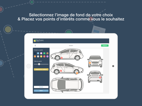 BePoint Pro est une application de prise de notes par l’image. Elle permet l’insertion d’images commentées et localisées grâce à des points numérotés sur une image de fond (un plan, une photographie, un vue aérienne, etc) importée depuis l’appareil photo ou la bibliothèque de votre iPhone. Le logiciel génère en fonction des informations données, un plan numéroté, les commentaires de chaque numéro, une légende des couleurs et une note.