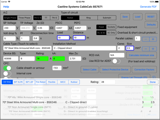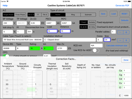 CableCalc BS7671 will calculate and check for voltage drop, disconnection time, fault current, earth fault data, overload and short circuit data and will produce a detailed print-out for each calculation in PDF format which can be printed to an AirPort compatible printer or emailed.