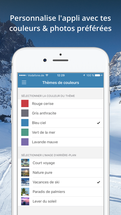 Personnalise l'application des fêtes et vacances en choisissant ta couleur et ton image d'arrière plan préférés.
