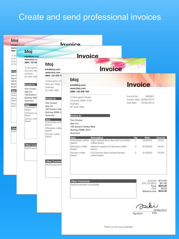 Create, send, and track invoices, estimates, quotes, POs, receipts, and timesheets on your iPhone and iPad, and keep your finances and accounting organized.
