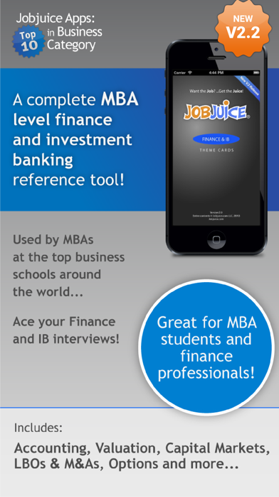 The Jobjuice Finance & Investment Banking App is a complete MBA level finance review and investment banking guide!