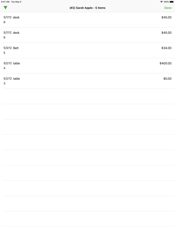 The item entry interface includes several design features that are optimized for a touch-screen, smaller display for popular mobile devices. A list of the 20 most commonly used categories speeds up item entry considerably. A graphical trend analysis tool calculates and displays pricing information based on the category and brand of the item being entered, based on the past year's sales data. Adding photographs to items is simple and quick both when using images from the device's photo library or when taking new pictures with the device's camera. This app also allows users to print tags for inventory, to email item lists directly to accountholders, and to view an account's transaction history.