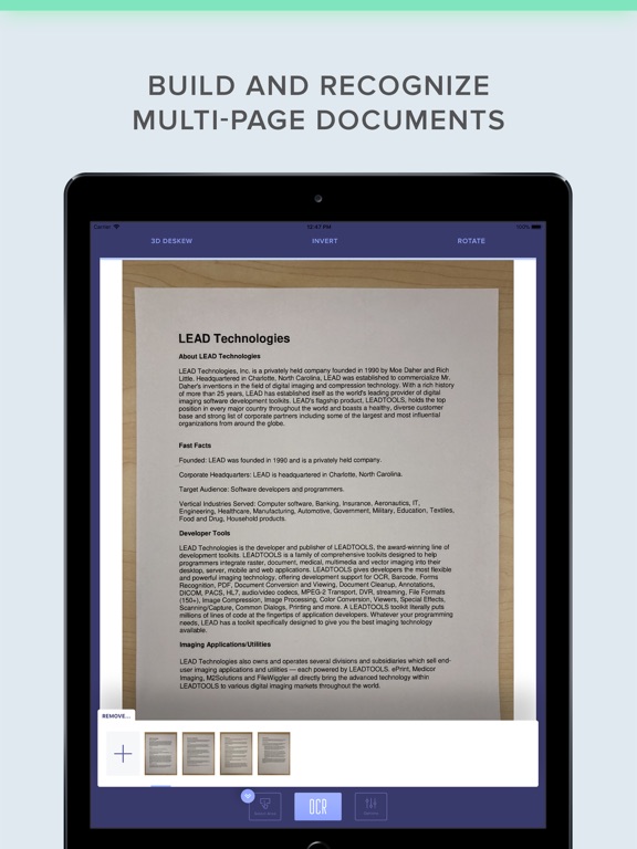 Developer NOTE: This is one of the applications that is provided with source code in LEADTOOLS, the award-winning SDK for programmers. Powered by patented machine learning algorithms, this application is built using the LEADTOOLS OCR engine. This app is intended to show developers some of the many capabilities that they can integrate into their own applications using LEADTOOLS. For more information or to download a free evaluation SDK of our full toolkit, including the source code for this app, visit: https://www.leadtools.com/sdk/ocr