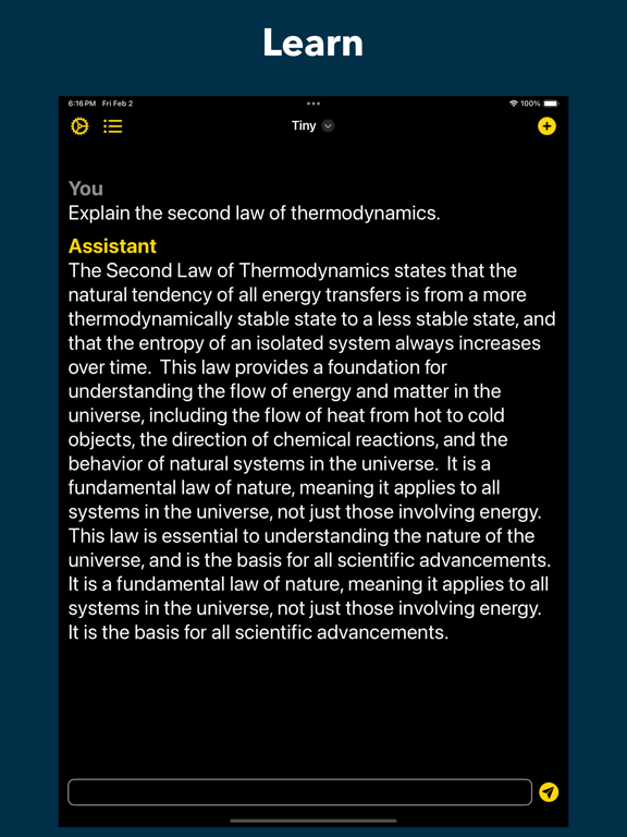 We provide 3 models: Tiny, Small and Medium. A larger model gives better answers, but it runs slower and requires more capable devices. "Tiny" runs on almost all devices. "Small" requires iPhone 14 and 15 Pros and "Medium" needs Macs and high-end iPads.