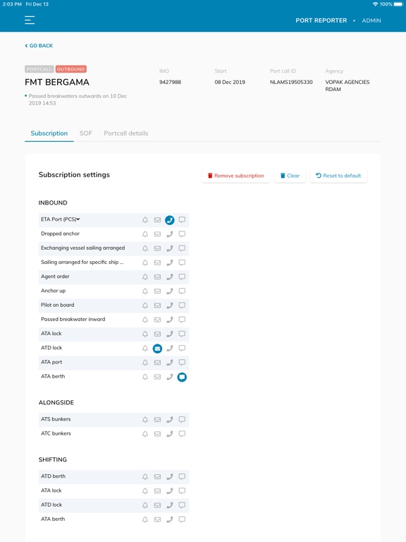 Port Call Reporting at hand: Port Reporter is the app for the port community to be up to date on the actual status of the port call. Configure all relevant events for the visiting, shifting, along-side operations and departing sea vessels and receive notifications, per e-mail, phone, sms or push messages. Providing insight for port call optimization.