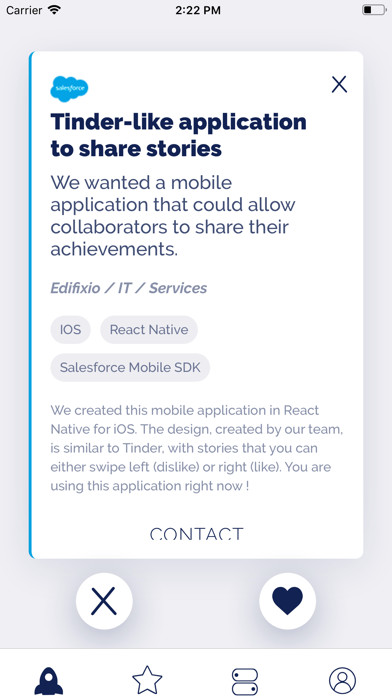 Cette application est dédiée aux employés Edifixio. Elle nous permet d’échanger idées et bonne pratiques, permettant ainsi à chacun de se mettre en relation très rapidement avec un collègue ayant eu une problématique similaire à la sienne. Cette application est construite en REACT et fonctionne en étant directement connectée avec notre CRM Salesforce et ainsi l’ensemble de nos employés. Elle peut être déclinée pour tout type de données nécessitant partage d’informations et mise en relation rapide.