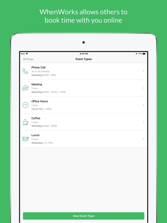 WhenWorks integrates directly with the built-in Calendar app on your iPhone, so it always knows your real-time availability and instantly updates your calendar as appointments are booked online.