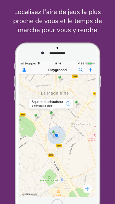 Playgroond vous fait découvrir les aires de jeux pour enfants autour de vous. L’application vous localise sur une carte puis fait apparaître les aires de jeux qui vous entourent ainsi que le temps de marche pour vous y rendre. Une fiche détaillée sur chaque aire de jeux vous permet d’en savoir un peu plus : tranche d’âge, horaires d’ouverture, équipements, note, photos, etc.