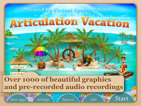 The Articulation Vacation app is built around a vacation theme and activities. Children will have fun practicing the articulation of various phonemes while “on vacation” and playing different built-in summer games.