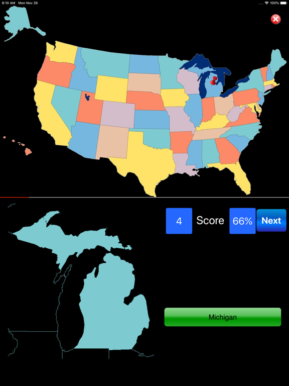 Identify the US States. GeoStates displays the outline of a state and marks its location on the map with a pin. You need to select the correct state name from a list of four.