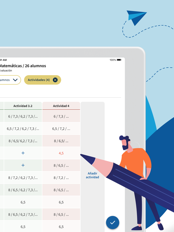 * Cuaderno de clase con personalización de actividades evaluables diarias y trimestrales, organizadas por categorías y con un sistema de calificación para obtener una nota propuesta en base a medias aritméticas o ponderadas.