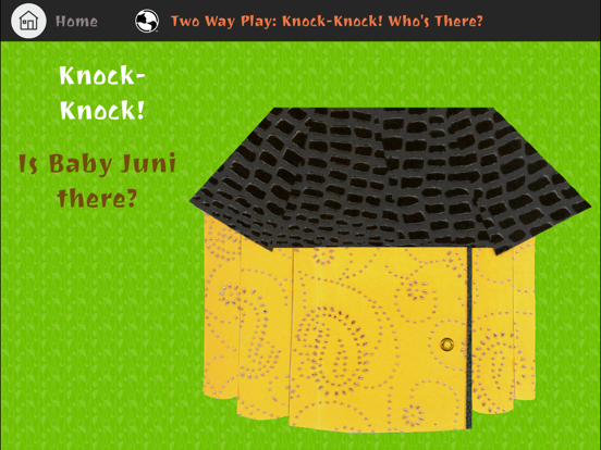 Knock-Knock! Who's There? is the first in a series of interactive, developmentally progressive, and educationally-informed app books for children and parents. This app is by Two Way Play, LLC, an enterprise dedicated to interactive play between parents and young children. The app comes from a book by Kim Foehl, MD, a psychiatrist and psychoanalyst working with children and parents. It was designed for the digital medium by Philip Wang and programmed by Chris Savina.