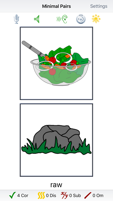 Minimal Pairs is an auditory discrimination activity that helps children discriminate between words that differ in pronunciation by one sound. They learn to hear the difference between words like “stop - top” and “rake - wake”. They are prompted to “Show Me” the target word by tapping on the colorful pictures and listening for the sounds in the target word and a foil.