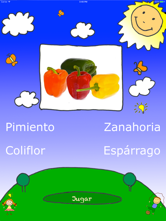 Haciendo clic en la figura del niño, activa el juego. Junto con una imagen de una verdura se muestran cuatro nombres y el niño debe seleccionar el nombre correcto de la verdura. Con sonido y color, se indica si la selección fue correcta o incorrecta. Sí el niño tiene duda, puede oprimir el símbolo de un foco, para que la aplicación indique el nombre correcto de la verdura, así como escucharla.