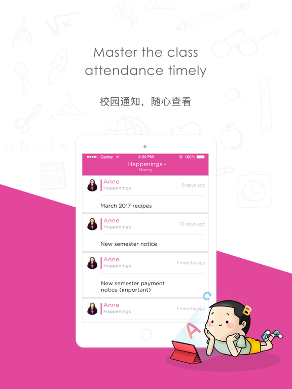Safety and Welfare: Rest assured as we record the time your child reaches or leaves school, and keep track of the person accompanying your child. You can also conveniently access records of your child’s information such as daily temperature and weight from wherever you are.