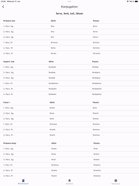 Die App findet auch deklinierte und konjugierte Formen und führt eine Formenbestimmung durch. Hier einige Beispiele: