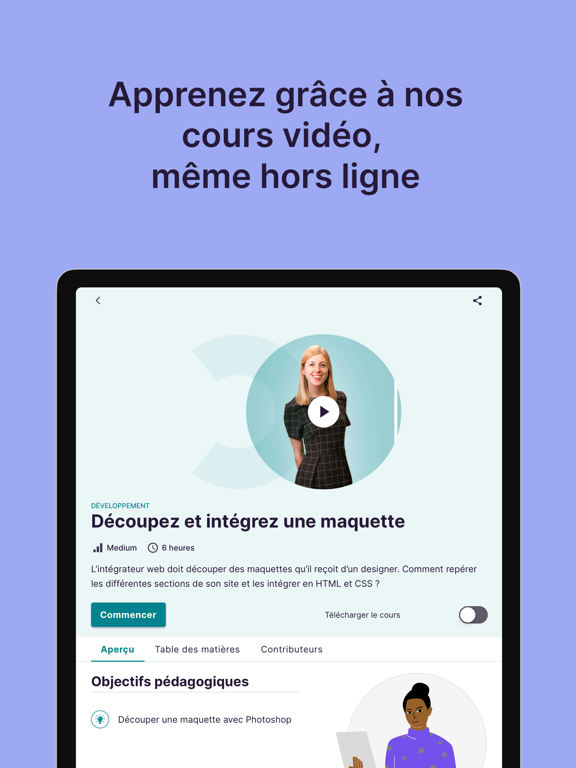Formez-vous au numérique grâce à nos cours innovants et gratuits en vidéo. Toutes les compétences de demain sont accessibles depuis votre app OpenClassrooms, à tout moment : vous maitriserez le développement web, la programmation mobile, la marketing digital, la data science... tout comme nos millions d'étudiants qui se forment gratuitement.