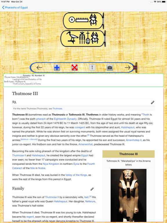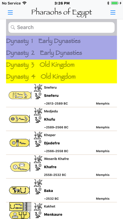 Egyptian artifacts and buildings are full of inscriptions of Kings and their political and religious messages written in hieroglyphs. The kings' names are written inside symbolic circles of rope called cartouches. This App is especially useful for identifying the Pharaoh from the cartouches written on a wall or a statue, or even a papyrus scroll. Use this App in a museum and get a better appreciation for the amazing story of 3,200 years of ancient Egyptian history! Collect as many Kings as you can find and store your finds in photos with the built-in Pharaoh Cam. Compete against your friends to find the most and take the best photos! This App has been tested in Egyptian Pyramids, Temples and tombs and it works Great! Before you leave on your trip to the Valley of the Kings, or even to the Metropolitan Museum of Art, you can cache the web biographies and use the App in those places where there is little to no WiFi or Cell data access. The hieroglyph search allows you to match a few symbols and identify a King even if you can't read hieroglyphs!