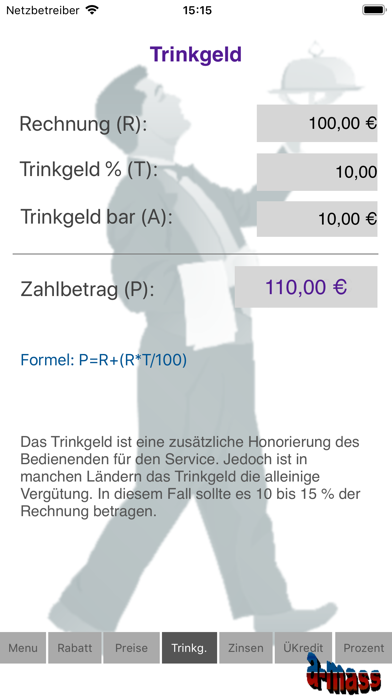 Praktisch sind die Trinkgeldberechnung sowie der Preisvergleich bei unterschiedlicher Verpackungsgröße.