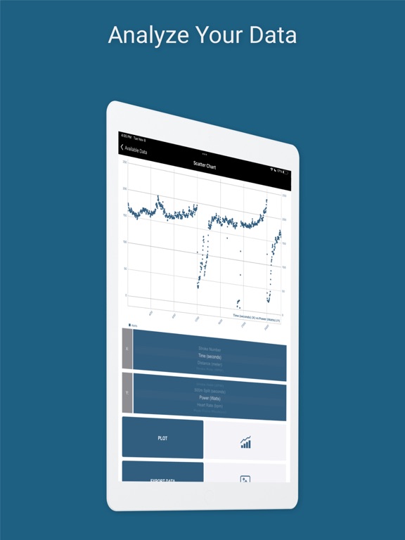 Rowing data can now be analyzed using a graphing screen. Users can select which variables they want to plot on the X and Y axis. Users have two options 1) A scatter plot graph which allows for any two variables to be plotted on the x and y axes. 2) A line graph which allows for plotting on any variable against time, distance or stroke count.