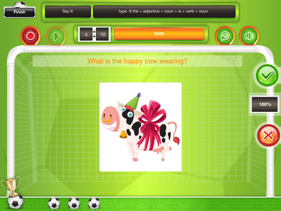 Children are welcomed by the soccer coach who encourages them to work hard. Children earn a soccer ball for each correct response, and when they accumulate enough balls, they can play a soccer game.