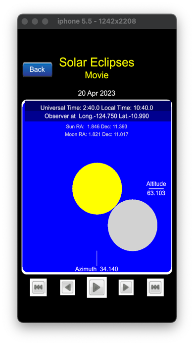 Il programma fornisce gli orari in Tempo Universale delle varie fasi dell'eclisse (iniziale, centrale e finale) e le coordinate geografiche da cui è possibile osservare queste tre circostanze dell'eclissi.