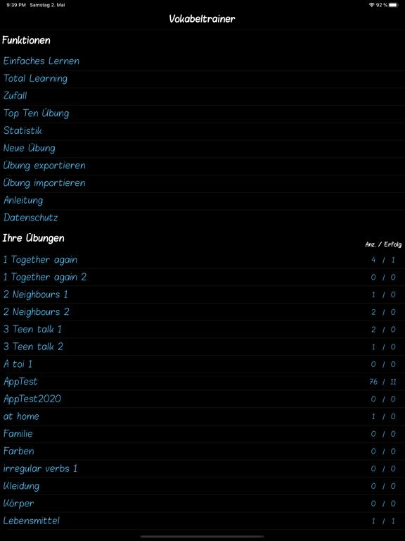 4. Top Ten Üben: Es werden die Vokabeln, die am meisten falsch eingegeben worden sind trainiert. Die Anzahl kann eingestellt werden.