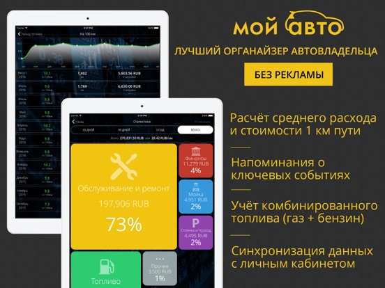 «Мой Авто» учтёт все затраты на автомобиль, подробно рассчитает расход топлива, напомнит о ТО и продлении страховки, проверит штрафы, поможет вести учёт расходников / заменённых деталей и будет хранить электронные документы в одном месте. То, что нужно, особенно, когда во владении не одна машина.