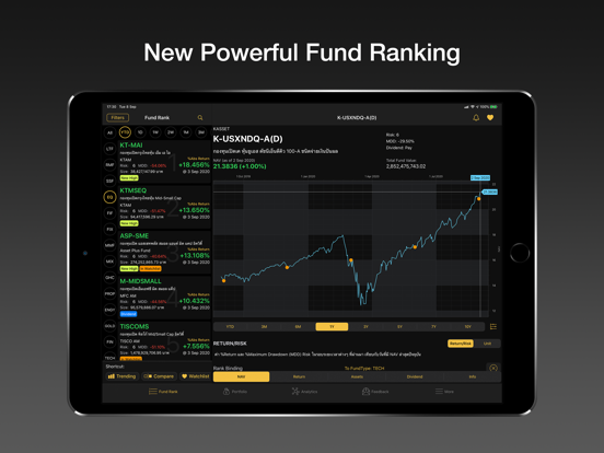 4. Analytics นวัตกรรมใหม่ที่คิดค้นมาเพื่อให้ทำการเปรียบเทียบ Performance กองทุนได้สะดวก รวดเร็ว เห็นจากกราฟได้ทันที รวมถึงยังมีความสามารถในการเรียงลำดับของกองทุนที่อยู่ใน Watch List ในกรอบเวลาที่สนใจ แตกต่างกันได้ และนอกจากนี้ ยังสามารถ ดูหุ้นไทยที่ถูกกองทุนรวมถือมากที่สุด เรียงตามลำดับต่างๆ ได้ รวมทั้งความสามารถอื่นๆ