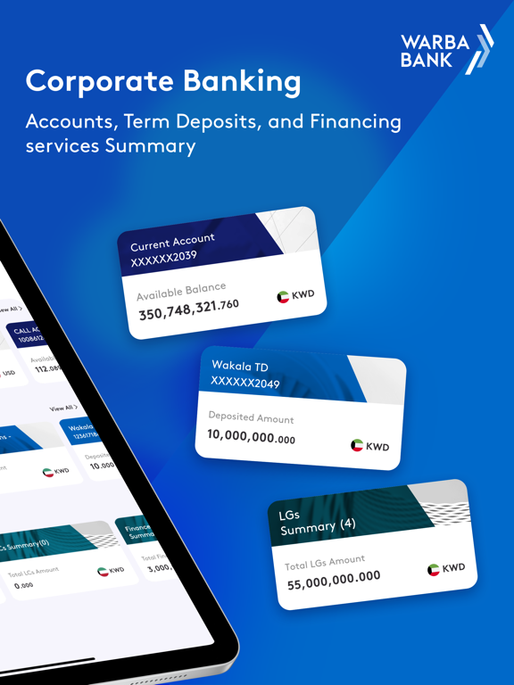 Introducing the new Corporate Banking mobile application for the first time in Warba Bank where the customer will be able to login to his corporate online banking account easily, anytime and anywhere through our application that will be available on mobile and tablet version in both Arabic and English languages