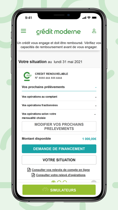 Avec votre application gratuite Crédit Moderne, retrouvez, où que vous soyez, votre espace personnel. Connectez-vous simplement avec votre identifiant et votre code secret pour accéder à l'ensemble des fonctionnalités offertes. Vous pourrez à tout moment :