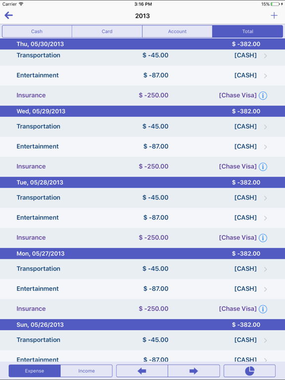 * Show total amount by account (Cash, Card, Account and Total)