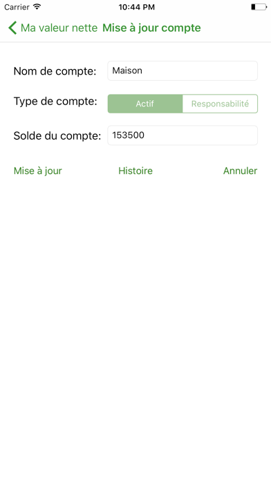 Cette application permet aux utilisateurs de garder une trace de leur valeur nette avec des écrans qui permettent de mettre rapidement à jour les informations. Vous pouvez utiliser cette application pour garder une trace de votre argent que vous dépensiez et consulter l'historique pour voir comment le compte a changé au fil du temps.