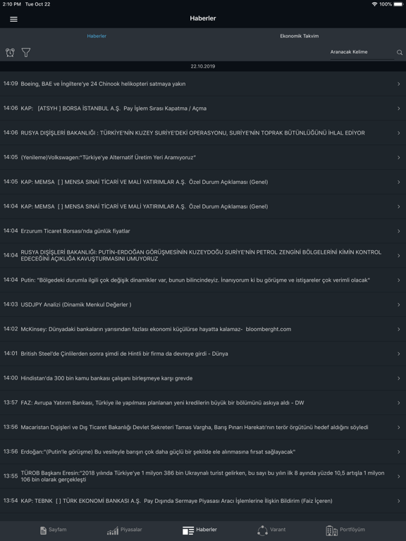 Finansal piyasalara ilişkin haberleri, yorumları ve şirket duyurularını anlık olarak takip edebilirsiniz. Fiyat izleme ekranlarındayken haber takibi yapabilirsiniz. Haberlerde arama ve filtreleme yaparak ilgilendiğiniz haberlere hızlıca ulaşabilirsiniz. Beklediğiniz haberler için alarm kurabilir, bildirimler ile alarmlarınız gerçekleştiğinde anında haberdar olabilirsiniz. Ekonomik Takvim verileri üzerinden piyasalarla ilgili gelişmeleri, açıklanacak verileri ülke seçimi ve önem derecesine göre filtreleyerek takip edebilirsiniz.