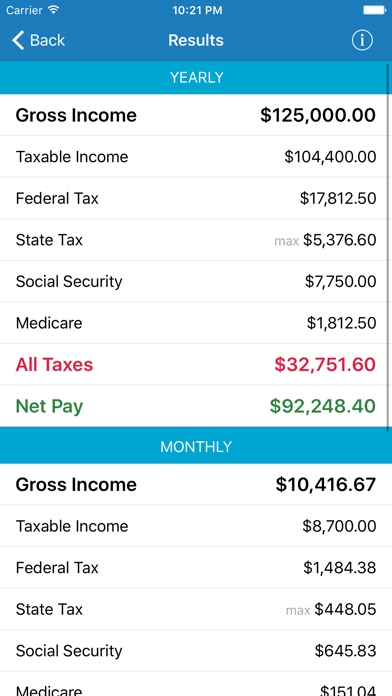 You only need to enter the amount of your salary for any period (year / month / week), indicate your marital status, and select a state. All other calculation will make the application.